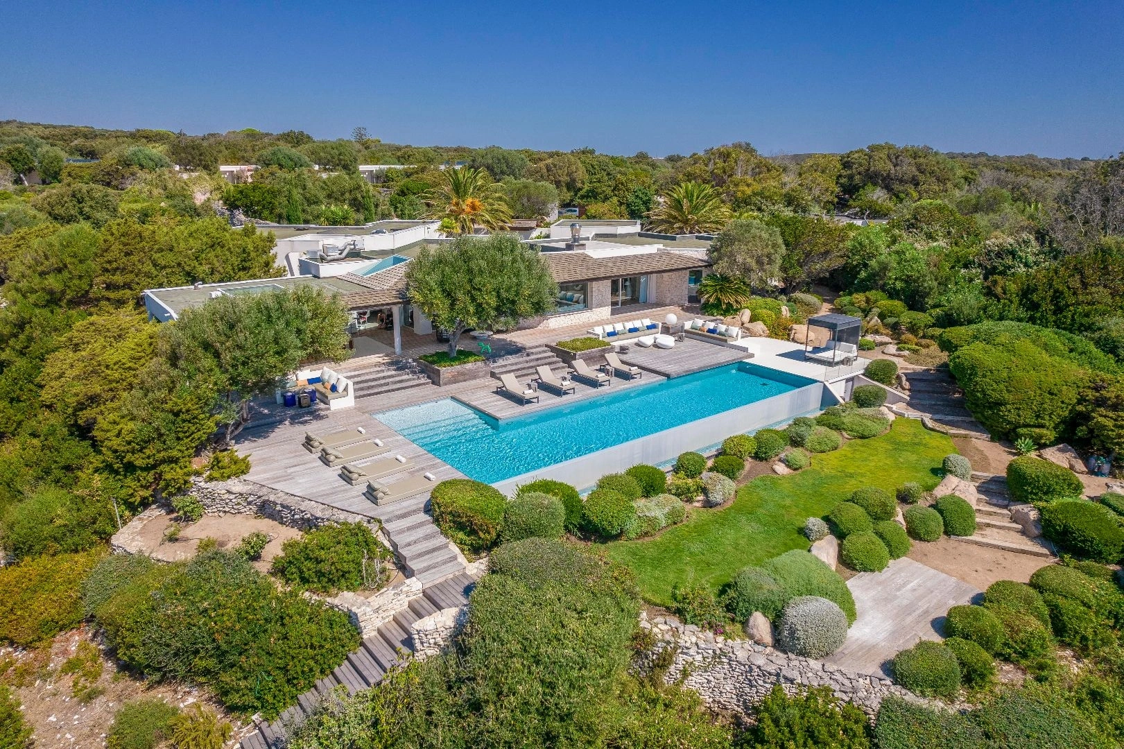 L’immense jardin méditerranéen paysagé de cette villa de luxe à Bonifacio vous procurera une sensation de plénitude instantanée. Sertie d’arbres centenaires et les essences endémiques, telle une pierre précieuse, la villa occupe un emplacement central au cœur de ces 4 hectares de nature endémique. Face à vous, Bonifacio se dévoilera subitement comme un accès immédiat au bonheur absolu.